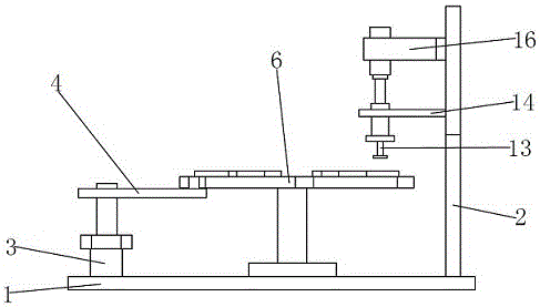 圖中標(biāo)記為:1、安裝平臺(tái);2、支撐板;3、電機(jī);4、擺動(dòng)桿;5、定位銷;6、工作轉(zhuǎn)臺(tái);7、定位槽;8、置物臺(tái);9、卡槽;10、驅(qū)動(dòng)機(jī)構(gòu);11、氣缸;12、活塞桿;13、打碼機(jī)構(gòu);14、滑板;15、滑槽;16、支座。
